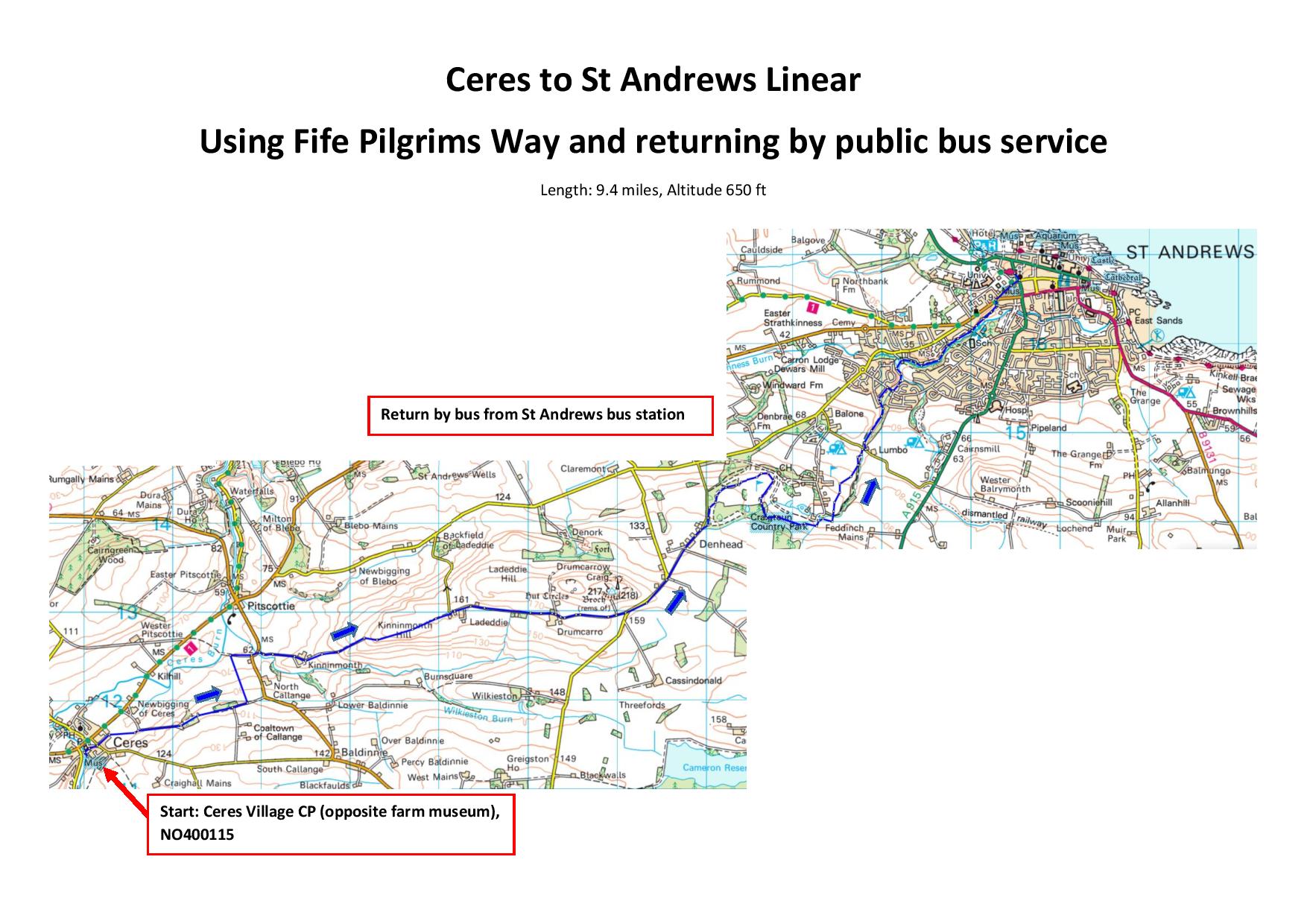 A linear walk - the last section of the Pilgrims Way Fife. Returning to the car park by public bus to Ceres.